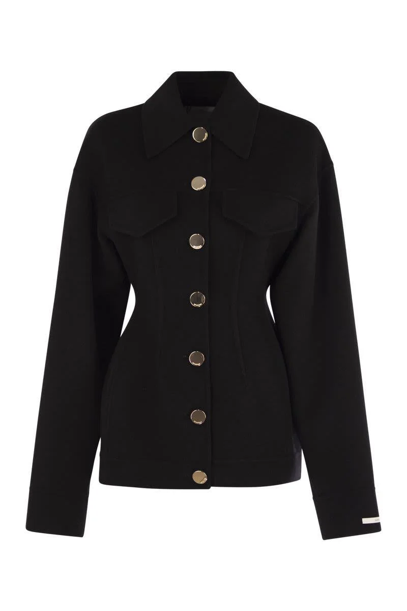 Fitted caban made of pure wool double, with deep darts and denim-inspired details. Closure with large mirror metal buttons with engraved logo. - Pure wool double drap caban - Tight fit on the bust and loose fit on the sleeves - Shirt collar - Visible metal button fastening - Dropped shoulder with yoke at front and back - Tight fit DESIGNER ID: 2522086011600 013 Gender: Women Material: 100% VIRGIN WOOL Color: Black Made in: Italy Product ID: 2522086011600 013 *Import tax/duty will be calculated at checkout (If applicable)