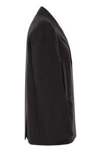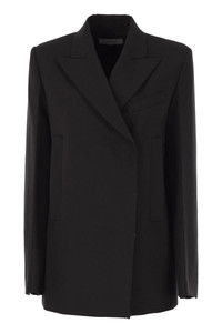 Clean lines and details that bring back to basics are the characteristics of this stretch wool gabardine blazer. The side pockets with piping and the straight shape add a masculine touch to the design. - Straight fit - Notched lapel neckline - Double-breasted construction with concealed button fastening - Cuffs with faux slits - Lined garment - Regular fit DESIGNER ID: 2522046052600 004 Gender: Women Material: 95% VIRGIN WOOL, 5% ELASTANE LINING: 70% ACETATE 30% POLYESTER SLEEVES LINING: 97% VISCOSE, 3% ACETATE Color: Black Made in: Italy Product ID: 2522046052600 004 *Import tax/duty will be calculated at checkout (If applicable)