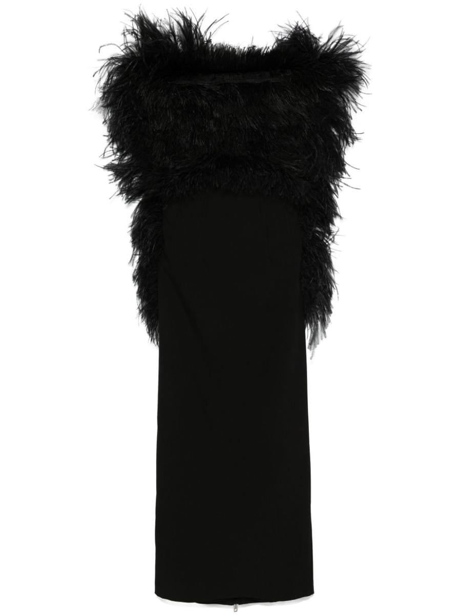black interlock twill weave ostrich feather concealed rear zip fastening square neck feather-trim detailing rubber grips boned bodice strapless straight hem mid-length This piece fits true to size. We recommend you get your regular size Model is 1,75m / 5ft 8in wearing size S Gender: Women Material: LINING: POLYESTER 100%, POLYAMIDE 78%, ELASTANE 22%, OUTER: POLYESTER 100%, OSTRICH FEATHER 100% Color: Black Made in: IT Product ID: 22226223600002 *Import tax/duty will be calculated at checkout (If applicable)