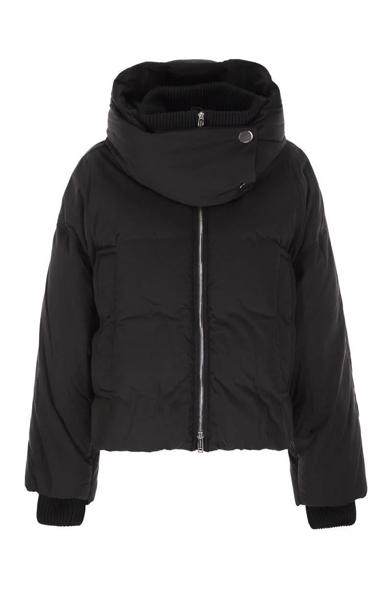 Soft, voluminous down jacket in technical water-repellent fabric with a crinkled effect, waist length. Made from technical water-repellent fabric, it has goose down padding and a removable hood that can be closed with press studs. - Loose fit - Raised ribbed knit collar and detachable hood - Front zip fastening - Side pockets with flaps - Ribbed knit collar and cuffs - Loose fit DESIGNER ID: 2522486012600 003 Gender: Women Material: 100% POLYAMIDE QUILTING: 100% POLYESTER PADDING: 85% DOWN, 15% FEATHER Color: Black Made in: Imported Product ID: 2522486012600 003 *Import tax/duty will be calculated at checkout (If applicable)