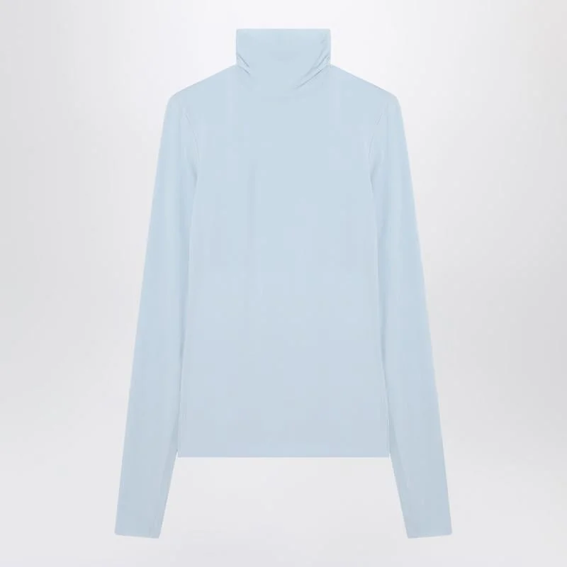 Light blue jersey knit sweater by Sportmax, featuring long sleeves, high neck, and slim fit. Gender: Women Material: 80% Polyamide - 20% Elastane Color: BLUE Made in: Italy Product ID: STONENY/R_SPORM-002 *Import tax/duty will be calculated at checkout (If applicable)