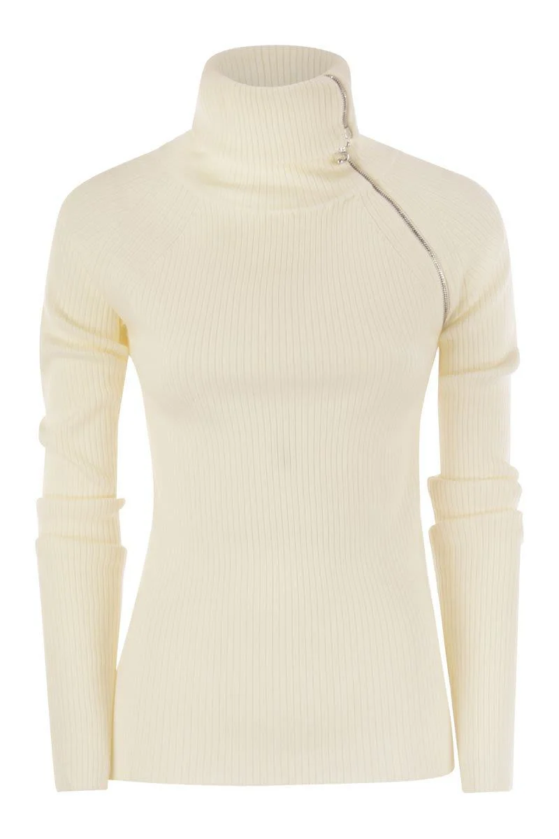 Stretch wool blend knit for a flattering silhouette. The special construction of the collar with a diagonal zip and second zip on the left side adds a sporty touch to the design. - Slim fit - High collar with contrasting interior - Diagonal zip opening on the collar and left shoulder - Side zip opening on the left side - Raglan sleeves DESIGNER ID: 2522366022600 001 Gender: Women Material: 100% VIRGIN WOOL Color: WHITE Made in: Italy Product ID: 2522366022600 001 *Import tax/duty will be calculated at checkout (If applicable)