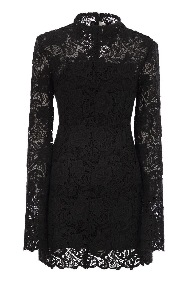 Floral macrame dress with a graphic silhouette, made from floral macrame. The construction with darts and shaped side panels emphasises the hips and cinches the waist. - Slim fit with rounded hips - High neck with invisible zip at the back - Darts at the waist and shaped side panels - Garment with matching scuba jersey slip DESIGNER ID: 2522626024600 001 Gender: Women Material: 100% POLYESTER UNDERGARMENT: 82% POLYESTER, 18% ELASTANE INNER FABRIC: 100% POLYESTER Color: Black Made in: Italy Product ID: 2522626024600 001 *Import tax/duty will be calculated at checkout (If applicable)