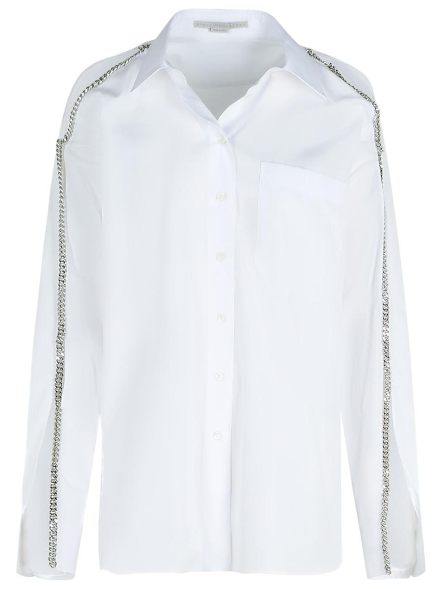 Pointed collar, front button closure, chest pocket embellished with 'Falabella' chains on the sleeves, cut-out shoulders, open cuffs with button, flared hem Gender: Women Material: 100% cotton Color: WHITE Made in: IT Product ID: 620137 SMA909000 *Import tax/duty will be calculated at checkout (If applicable)