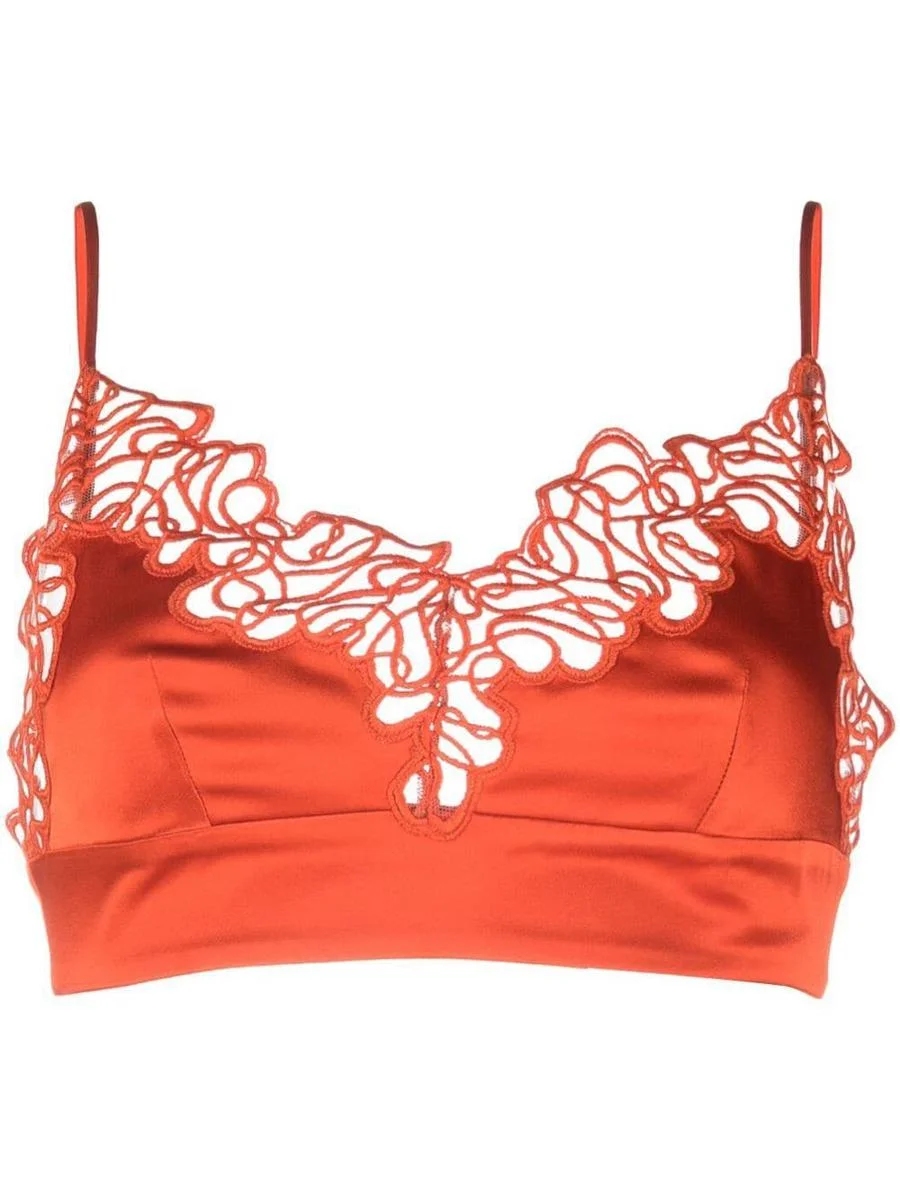 lace-trim triangle bra top from STELLA MCCARTNEY featuring scarlet, satin finish, lace trim, triangle cup, adjustable spaghetti straps and rear hook and eye fastening. Conscious: We've partnered with Good On You – an ethical agency that rates how sustainably brands perform. This product comes from a brand that performs well in relation to their impact on animals.. This piece fits true to size. We recommend you get your regular size Model is 1,75m / 5ft 8in wearing size 40 (IT) Gender: Women Material: COTTON 82%, ACETATE 64%, SUSTAINABLE VISCOSE 36%, POLYESTER 11%, POLYAMIDE 7% Color: RED Made in: IT Product ID: 6T00343AU3096025 *Import tax/duty will be calculated at checkout (If applicable)