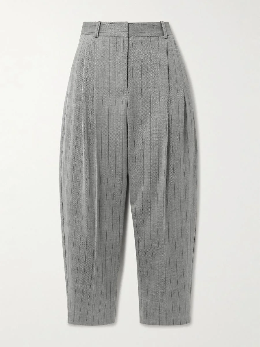 Cropped pleated pinstriped wool-blend twill tapered pants Gray