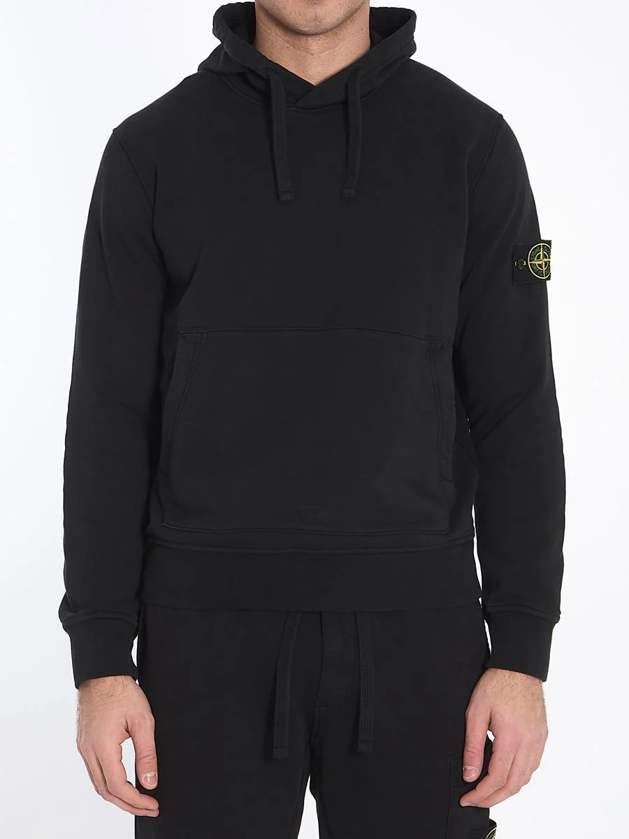Hoodie in black organic cotton fleece. It features a drawstring hood, a front pouch pocket, a Stone Island patch on the left sleeve, overlock stitching, and ribbed cuffs and hem. Regular fit. The model is 186cm tall and wears a size L. Size nationality: INT Gender: Men Material: 100% COTTON; DETAIL: COTTON, ELASTANE Color: Black Made in: RO Product ID: 33647134 K1S156100045 S0051 V0029 *Import tax/duty will be calculated at checkout (If applicable)