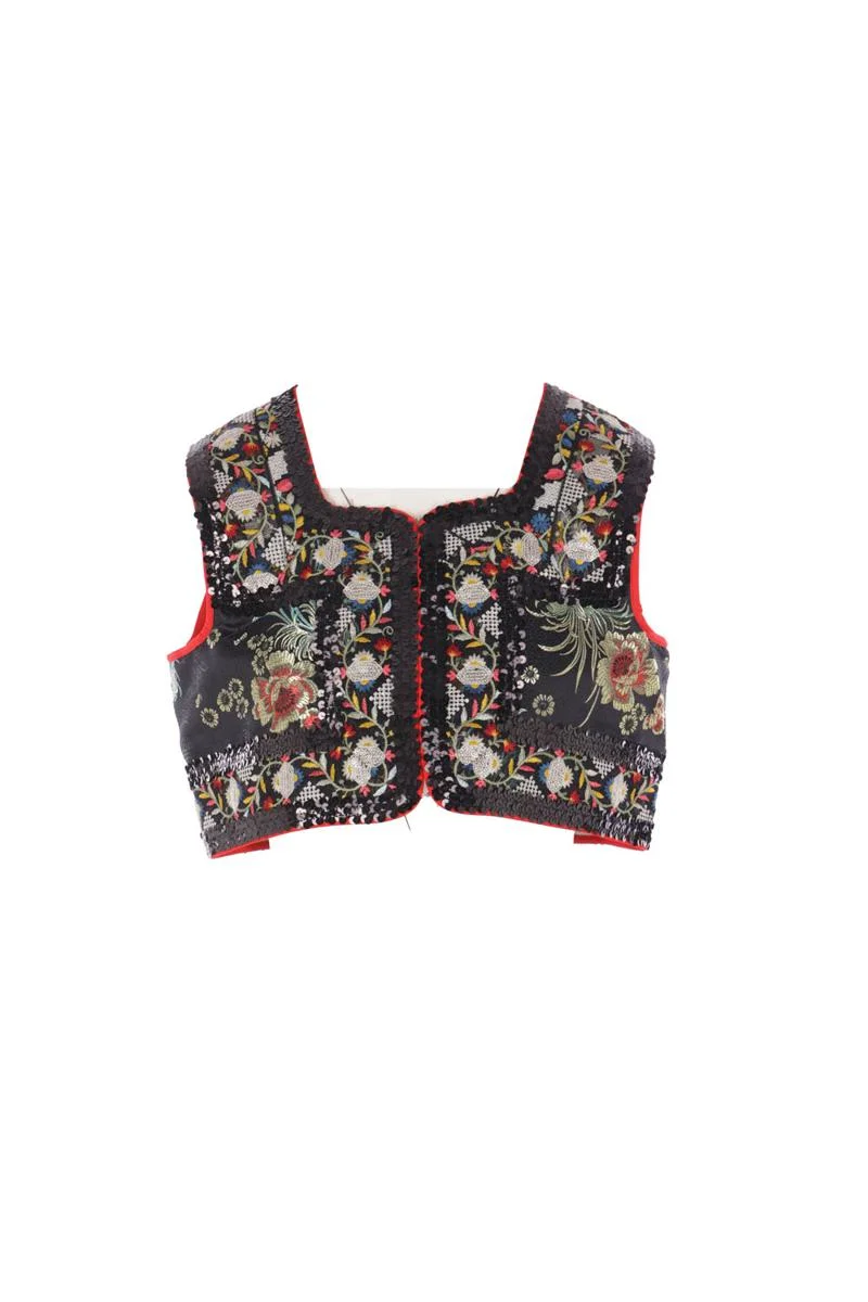 Tao Comme des Garcons vest made from black tulle with multicolor floral embroidery, jacquard side panels, and sequined embroidery along the edges. Features a square neckline, front hook closure, contrasting edges, straight hem, and beige cotton-linen canvas lined interior. Gender: Women Material: BODY: NYLON 50% POLYESTER 50% TAPE: POLYESTER 100% Color: Black Made in: Imported Product ID: TPB014W251BLACK *Import tax/duty will be calculated at checkout (If applicable)