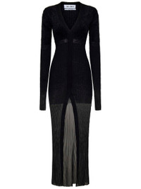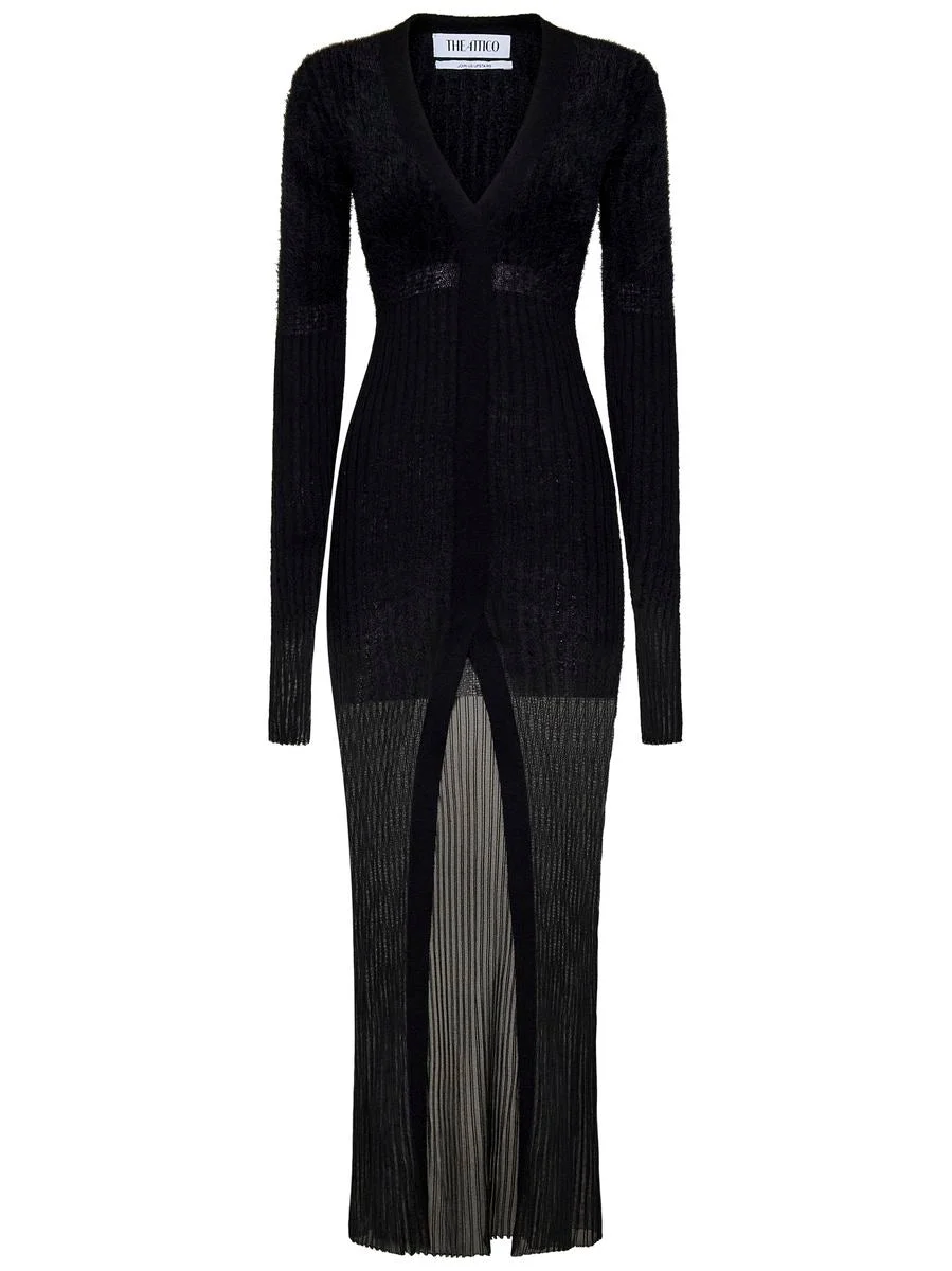 This garment features a black ribbed knit with a brushed texture, showcasing semi-sheer panels. It has a V-neckline, long sleeves, and a front slit, with a straight hem that falls to a mid-length. The piece is unlined for a lightweight feel. Gender: Women Material: 50%POLYAMIDE 22%MOHAIR 16%NYLON 6%POLYESTER 6%WOOL Color: Black Made in: IT Product ID: 247WCM178KMIX4629 *Import tax/duty will be calculated at checkout (If applicable)