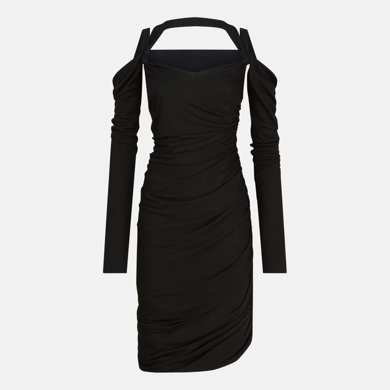 Black viscose crepe midi dress by The Attico, characterized by an off-the-shoulder design, fitted silhouette, woven details, and a back logo patch. Gender: Women Material: Fabric I: 100% Viscose / Fabric II: 69% Polyamide - 31% Elastane Color: Black Made in: Italy Product ID: 251WCW00248VVV105A/R_ATTIC-100 *Import tax/duty will be calculated at checkout (If applicable)