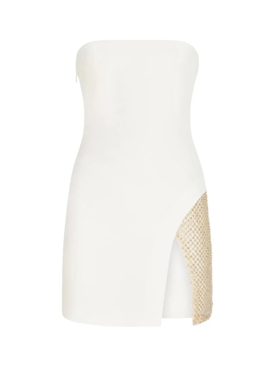 Invisible side zip closure Strapless neckline Crystal embroidered mesh insert at side Side slit at front Regular fit White color 89% Polyester, 11% Elastane Made in Italy Gender: Women Material: 89% POLYESTER, 11% ELASTANE Color: WHITE Made in: Italy Product ID: 251WCA00439PLL008RA001 *Import tax/duty will be calculated at checkout (If applicable)