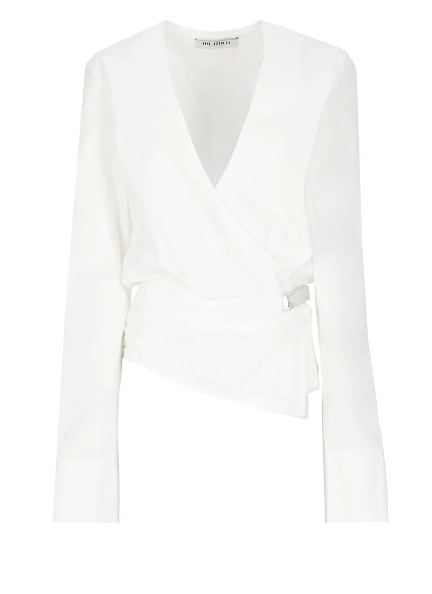 - White The Attico cotton blouse for woman - V-neck - Long sleeves with buttons at hem - Front metal detail with logo Model's height is 179 cm and she wears a size 40 Gender: Women Material: 100% COTTON Color: WHITE Made in: Italy Product ID: 251WCE00005CCC052AA001 *Import tax/duty will be calculated at checkout (If applicable)