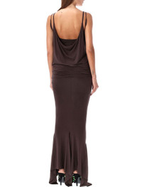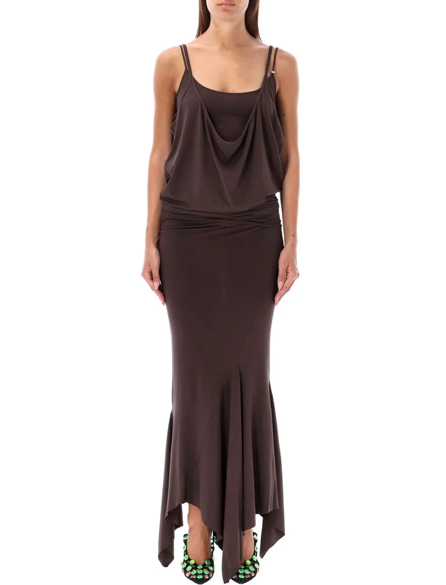 Midi dress by The Attico. Featuring: Brown fabric Slim fit with draped design Double spaghetti straps Sleeveless Asymmetrical hemline Model is 1,72 and wears size 40. Gender: Women Material: 92% VISCOSE 8% ELASTANE Color: Brown Made in: IT Product ID: 24A247WCM121J045#204 *Import tax/duty will be calculated at checkout (If applicable)