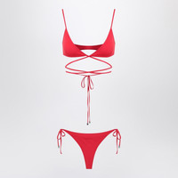 Two-piece bikini by The Attico in red stretch fabric, featuring a bra with long ties to be knotted around the bust, contrasting logo on the back, and a giftable panty with side ties with metal tips. Gender: Women Material: 80% Polyamide - 20% Elastane Color: RED Made in: Portugal Product ID: 250WBC00009PAA094A/Q_ATTIC-010 *Import tax/duty will be calculated at checkout (If applicable)
