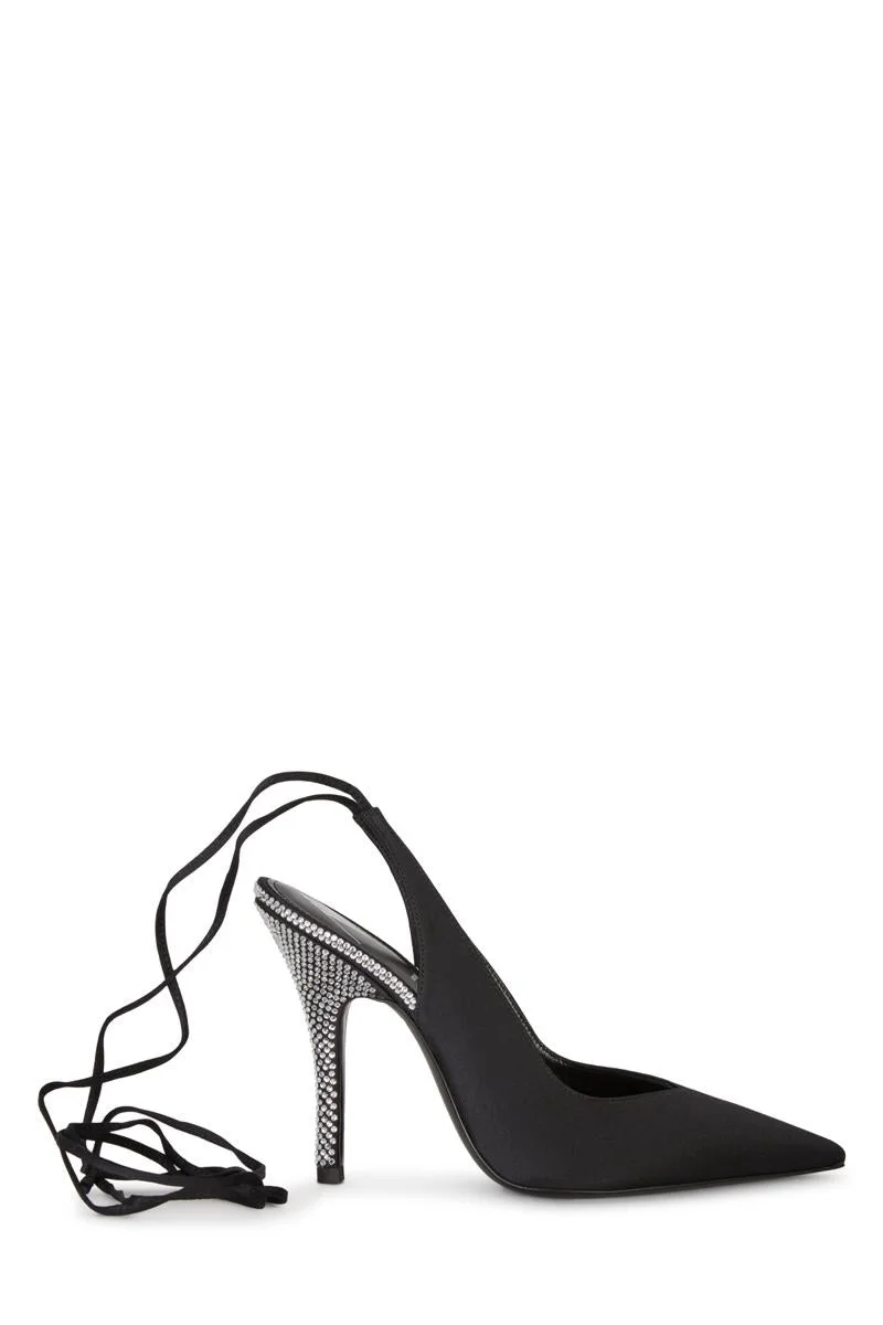 Venus satin slingback pumps by The Attico with knotted ankle lace and featuring a rhinestone-covered heel. Leather footbed and leather sole. Heel height: 10,5 cm Gender: Women Material: 100% POLYESTER Color: NERO Made in: IT Product ID: 231WS032TV07 212 *Import tax/duty will be calculated at checkout (If applicable)