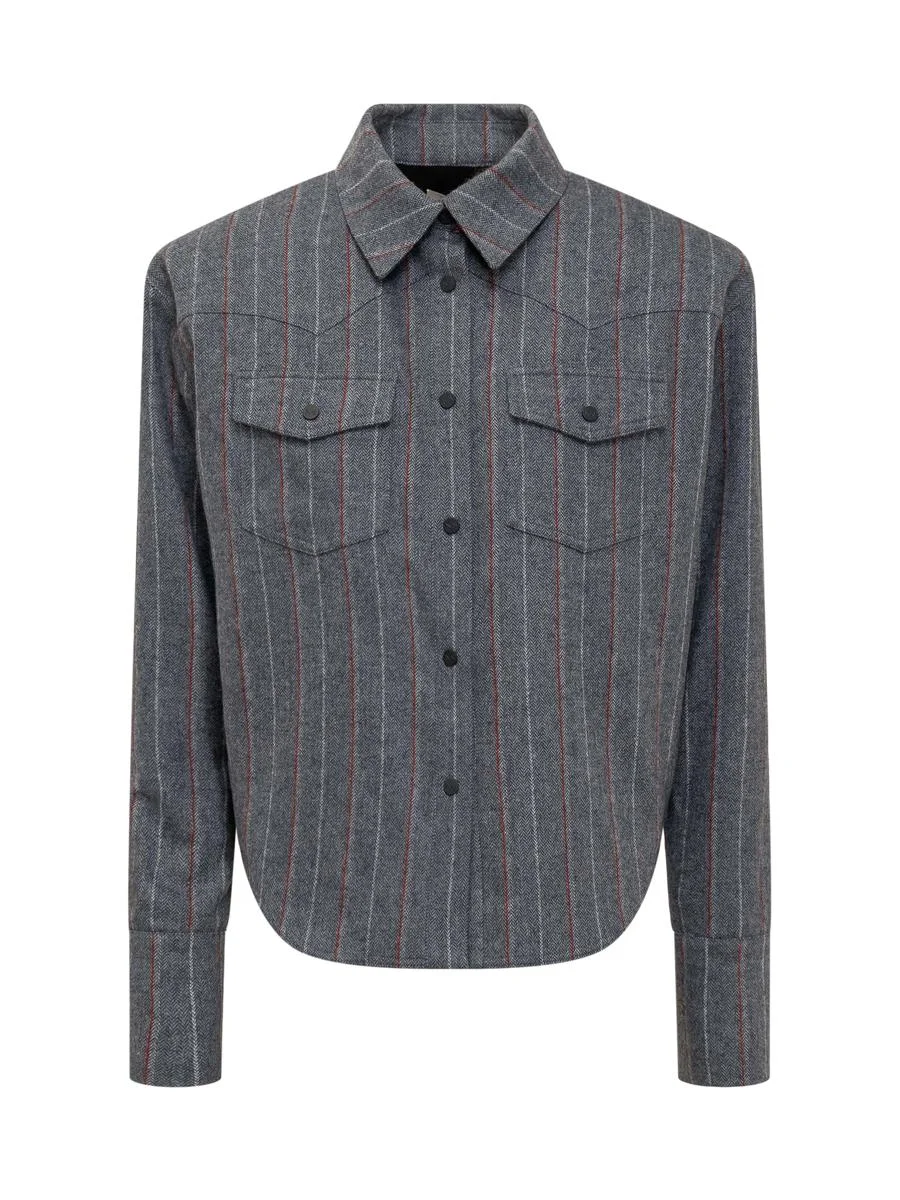 Long-sleeved shirt. Front button closure. Striped pattern. Button pockets on chest. Buttons at cuffs. Gender: Women Material: OUTSIDE:49% WOOL 39% POLYESTERB 12% VISCOSELINING:100% VISCOSE Color: GREY Made in: PL Product ID: W22TMCAMPOSHIRT GREY *Import tax/duty will be calculated at checkout (If applicable)