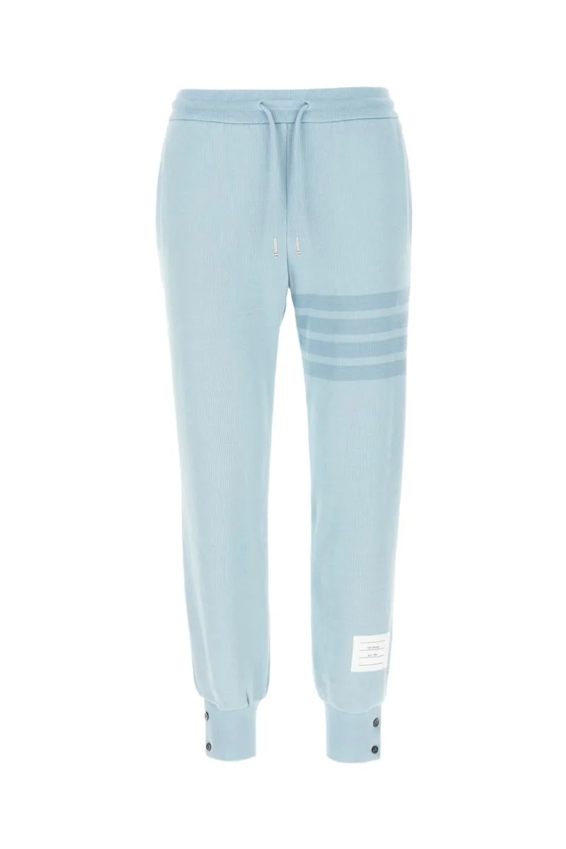 Thom Browne joggers made from pure cotton knit, with tonal engineered 4-Bar motif on the leg. They feature elasticated waistband with drawstring, side welt pockets, elasticated cuffs with buttons and Name Tag on the hem, tricolor grosgrain loop tab on the back of the waist. Regular fit. The model is 177 cm tall and wears size IT 38. Gender: Women Material: 100%COTTON Color: CELESTE Made in: JP Product ID: FJQ109AJ0051 480 *Import tax/duty will be calculated at checkout (If applicable)