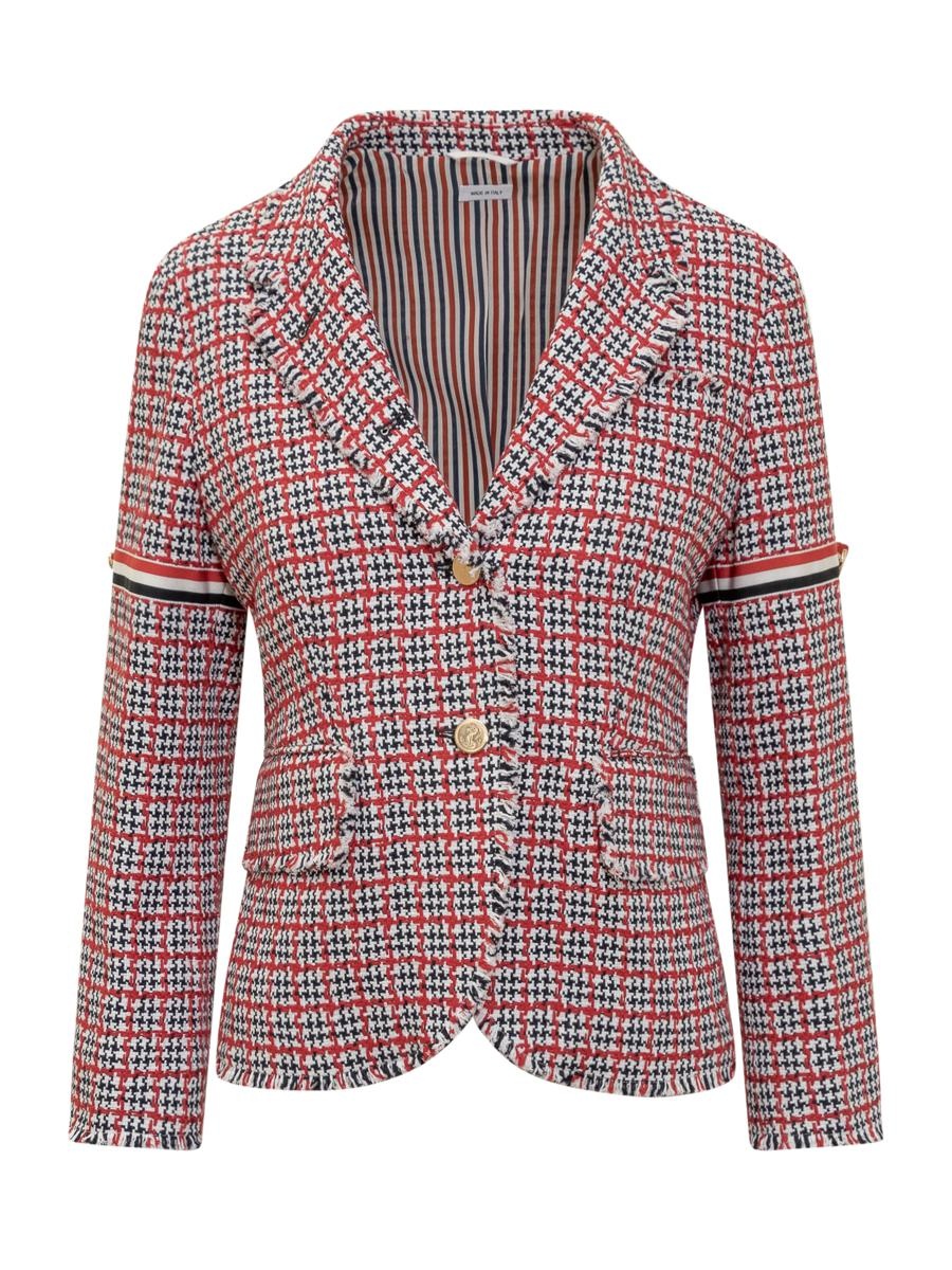 Tweed fabric jacket. Front button closure. Two flap pockets. Single chest pocket. Grosgrain bandsButtoned cuffs with striped grosgrain trim. Striped lining with inside pocket and name tag.Signature striped grosgrain loop tab. Gender: Women Material: OUTSIDE:100% COTTON LINING:100% SILK Color: RED Made in: IT Product ID: FBC812TF0511 960 *Import tax/duty will be calculated at checkout (If applicable)