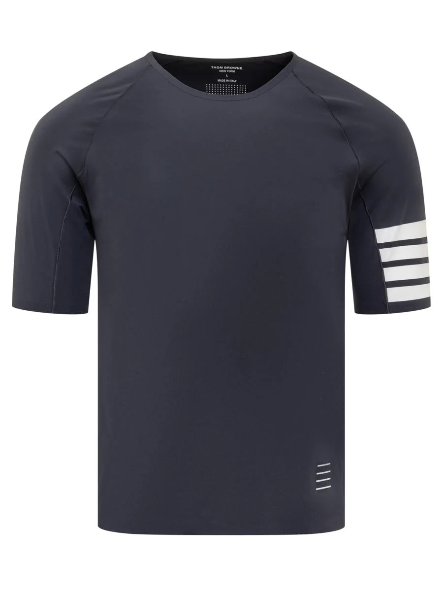 Blue T-shirt. Compression tightness. Short sleeves. Crew neck. 4-bar stripes on sleeve. Center stripe on back. Signature tricolor grosgrain flag on back. Gender: Men Material: 85% COTTON 15% ELASTANE Color: BLUE Made in: IT Product ID: MJA008Y06770 461 *Import tax/duty will be calculated at checkout (If applicable)