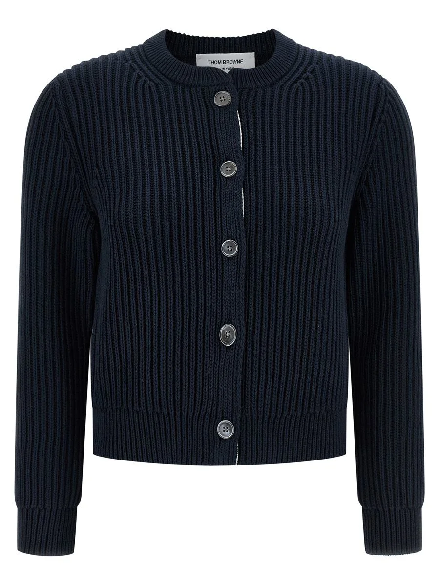 cod. FKC692AY3062415 Knitted cotton cardigan, crop model, crew neck, front button closure with RWB grosgrain tape lining, long cuffed sleeves. Color: Blue Size & Fit: true to size fit Composition: 100% cotton Made in: Italy