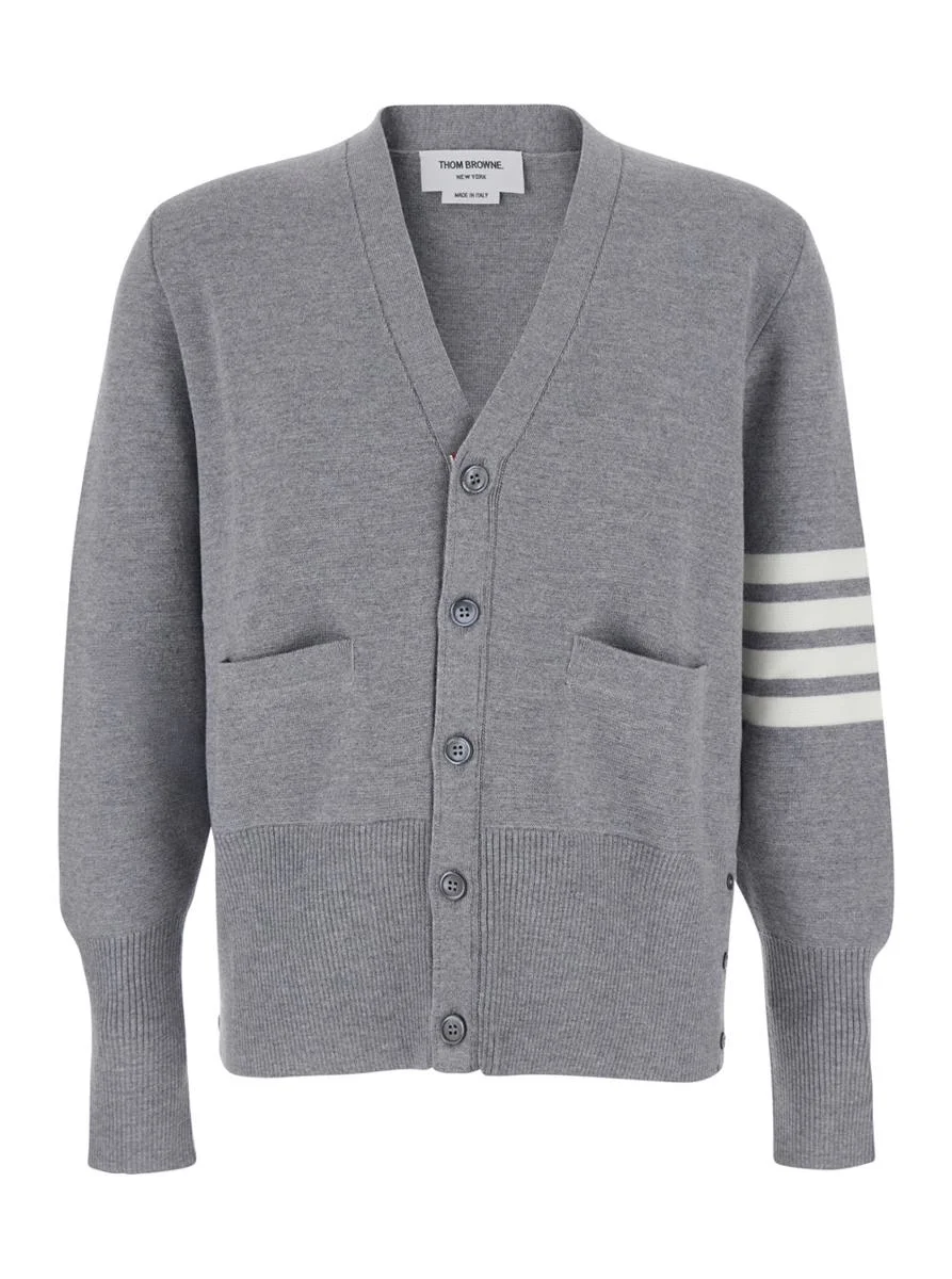 Thom Browne Grey Cardigan With V Neck And Striped Detail On The Sleeve In Wool Man