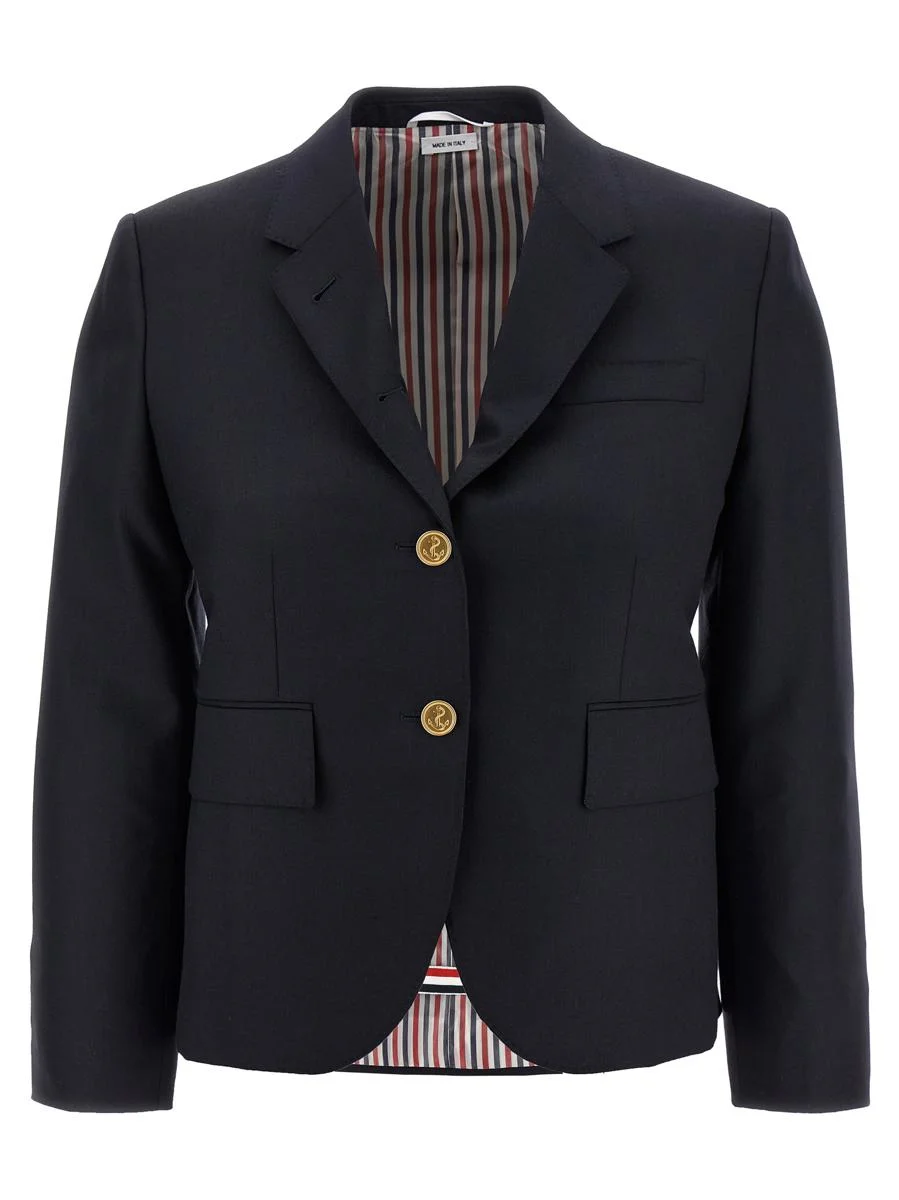 Thom Browne's single-breasted jacket crafted in blue wool twill. Featuring notched lapel, button fastening, 7/8 sleeves with buttoned cuffs, padded shoulders, front pockets and back side vents. Tricolor striped twill lining. The design is completed by the signature striped grosgrain loop tab at back. Gender: Women Material: SELF: 100% WOOL ,LINING: 100% CUPRO Color: BLUE Made in: IT Product ID: FBC010V00626415 *Import tax/duty will be calculated at checkout (If applicable)
