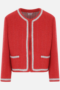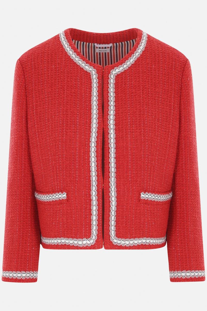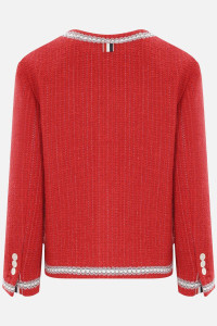 Thom Browne cardigan jacket crafted in red tweed with contrasting trims. It features a crew neckline, hook closure, three-quarted sleeves with buttoned cuffs, front pockets and straight hem. Tricolor silk lining. Gender: Women Color: RED Made in: IT Product ID: FBC932BF0799600 *Import tax/duty will be calculated at checkout (If applicable)