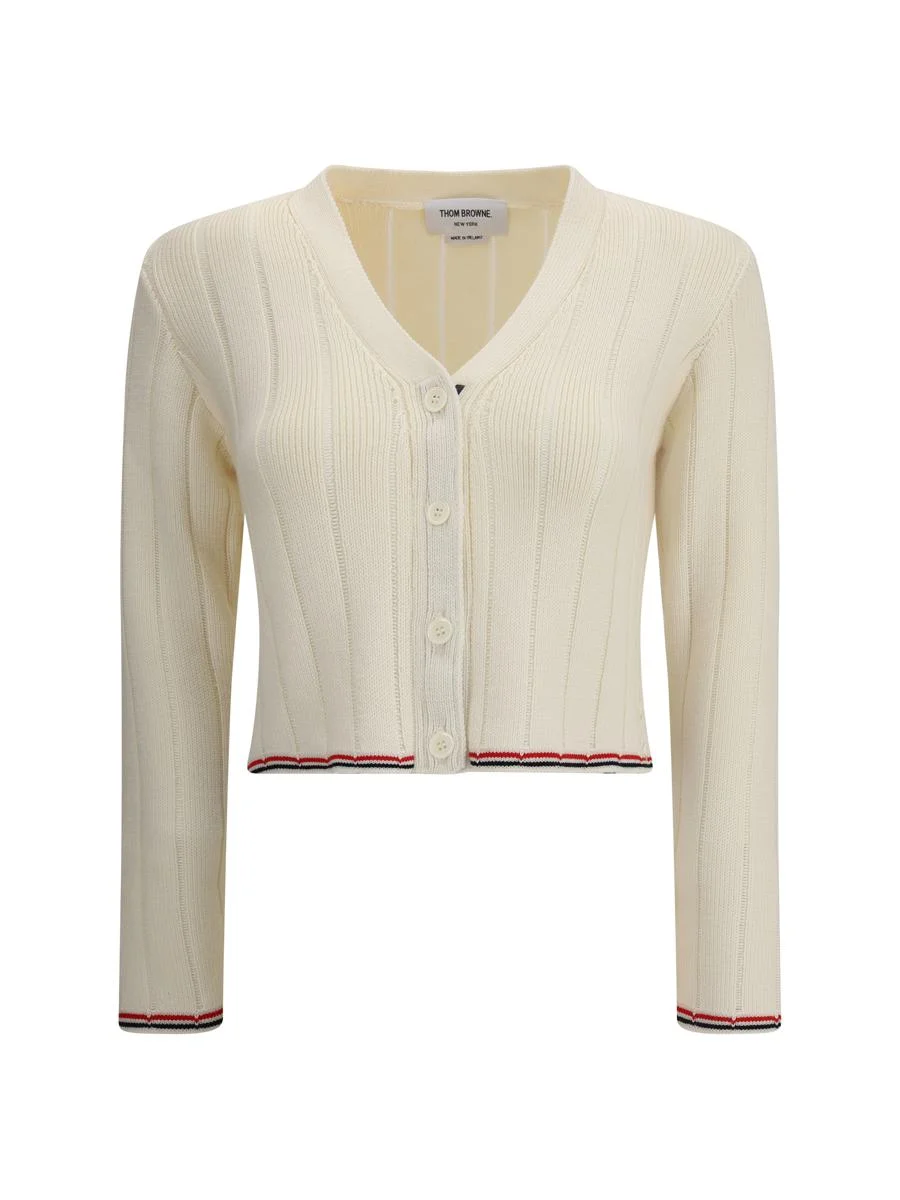 VIRGIN WOOL CROPPED CARDIGAN FROM THOM BROWNE, FEATURING A V-NECK FRONT AND BUTTON CLOSURE. THE RIBBED DESIGN LENDS A REFINED, STRUCTURED LOOK, WHILE ADJUSTABLE SIDE SLITS WITH BUTTONS OFFER VERSATILITY AND COMFORT. HEM AND CUFFS ARE EMBELLISHED WITH THE ICONIC COLORED BANDS, A DISTINCTIVE SYMBOL OF THE BRAND. AN ELEGANT AND CONTEMPORARY GARMENT, PERFECT TO ENRICH ANY OUTFIT. RTW IT Gender: Women Material: FLEECE WOOL Color: Beige Made in: Ireland Product ID: FKC663AY1024_100 *Import tax/duty will be calculated at checkout (If applicable)