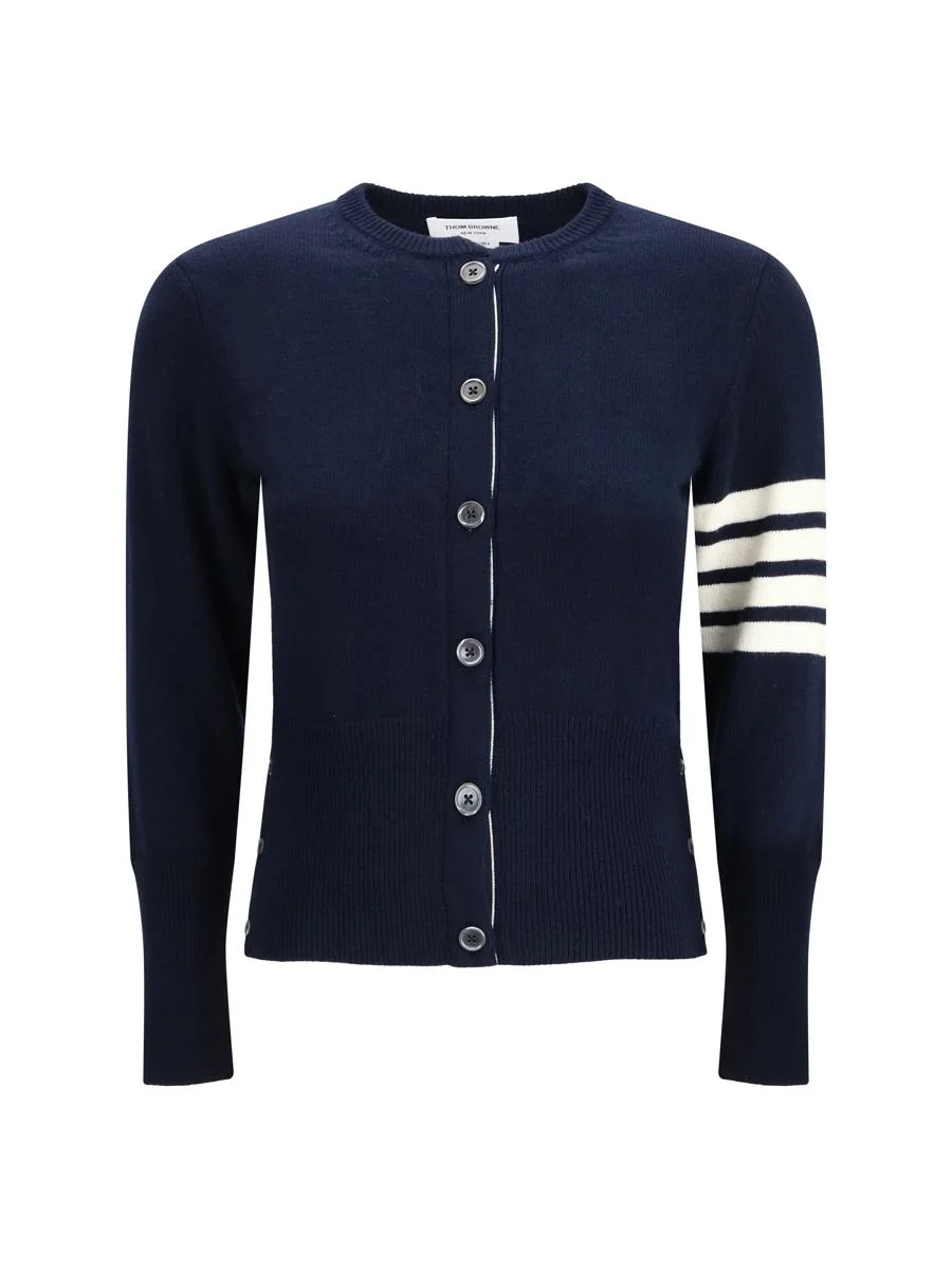Crafted from virgin wool, this Thom Browne cardigan features a relaxed, long-sleeved silhouette. The intarsia design is complete with a crew neckline, ribbed trims, and the brand's 4-Bar stripe detail at the left sleeve. Product Details - Material: 100% virgin wool - Care instructions: dry clean - Made in Italy - Color: blue - Designer color name: Navy - Item color: blue, white - Contains non-textile parts of animal origin - Cuff: buttoned, ribbed - Closure: buttoned front - Hem: ribbed - Item number: P01104006 Size & Fit - True to size - Straight fit - Slightly stretchy fabric - Slightly cropped - The model seen in the picture is 178cm-5'10" and wearing a size IT 40