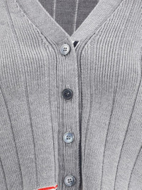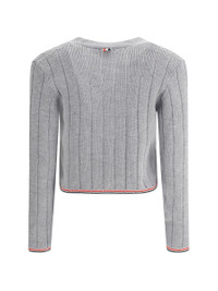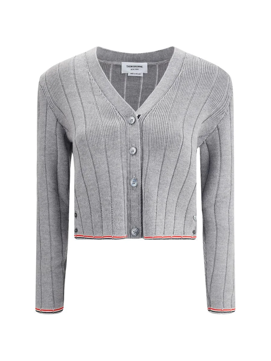 VIRGIN WOOL CROPPED CARDIGAN FROM THOM BROWNE, FEATURING A V-NECK FRONT AND BUTTON CLOSURE. THE RIBBED DESIGN LENDS A REFINED, STRUCTURED LOOK, WHILE ADJUSTABLE SIDE SLITS WITH BUTTONS OFFER VERSATILITY AND COMFORT. HEM AND CUFFS ARE EMBELLISHED WITH THE ICONIC COLORED BANDS, A DISTINCTIVE SYMBOL OF THE BRAND. AN ELEGANT AND CONTEMPORARY GARMENT, PERFECT TO ENRICH ANY OUTFIT. RTW IT Gender: Women Material: FLEECE WOOL Color: GREY Made in: Ireland Product ID: FKC663AY1024_055 *Import tax/duty will be calculated at checkout (If applicable)