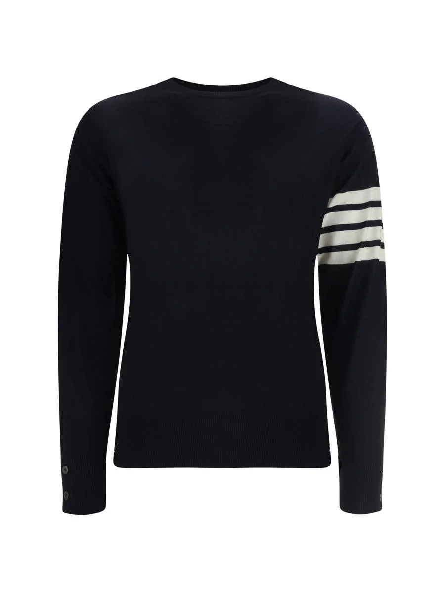 VIRGIN WOOL SWEATER FROM THOM BROWNE, RIBBED CREW NECK, RIBBED HEM, RIBBED CUFFS, BRAND'S ICONIC CONTRASTING BANDS ON LEFT ARM, MONOCHROME PATTERN, REGULAR FIT. NUMERIC Gender: Men Material: FLEECE WOOL Color: NAVY Made in: IT Product ID: MKA002AY1014_415 *Import tax/duty will be calculated at checkout (If applicable)