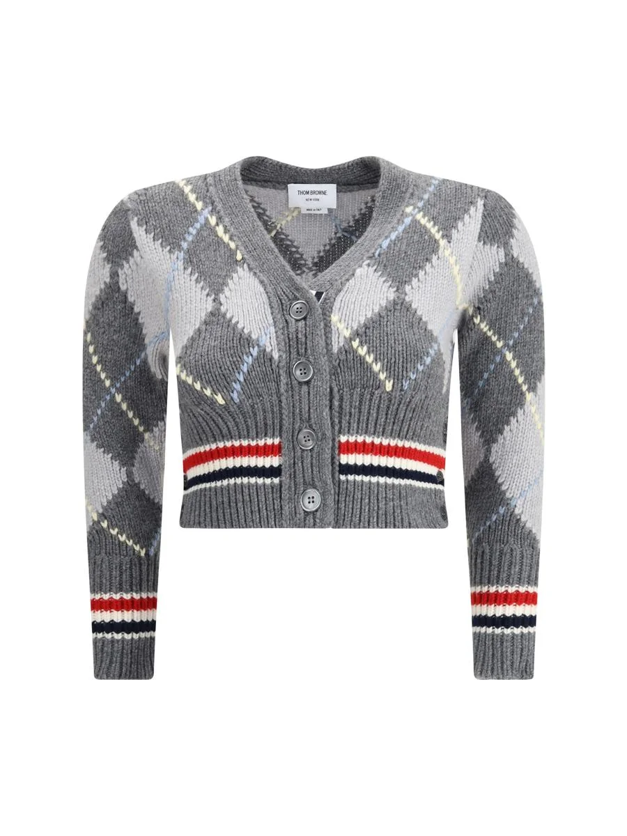 THOM BROWNE'S ARGYLE V-NECK CARDIGAN IS CRAFTED FROM SOFT MERINO WOOL AND EMBELLISHED WITH THE ICONIC DIAMOND PATTERN THAT GIVES THE GARMENT A TIMELESS ELEGANCE. WITH ITS SHORT, MODERN SILHOUETTE, IT FEATURES A V-NECK, LONG SLEEVES AND FRONT BUTTON CLOSURE. A PERFECT BALANCE BETWEEN CLASSIC TAILORING AND CONTEMPORARY STYLE, IDEAL FOR COMPLETING EVERYDAY LOOKS WITH A SOPHISTICATED TOUCH. RTW IT Gender: Women Material: FLEECE WOOL | POLYAMIDE Color: GREY Made in: Italy Product ID: FKC679AY1029_982 *Import tax/duty will be calculated at checkout (If applicable)