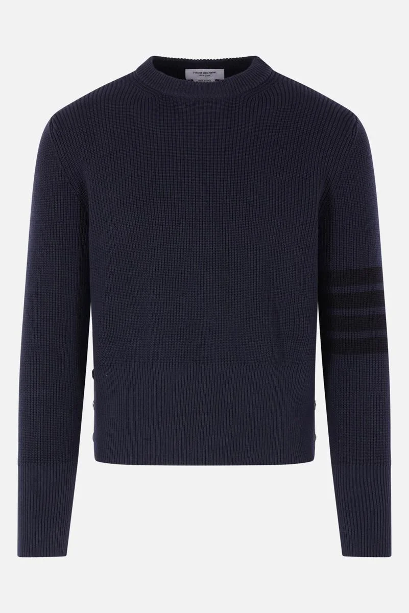A warm-weather take on a core silhouette, this cotton pullover is garment dyed for nuanced tone and a soft, broken-in hand. Designed for transitional layering, it pairs well with a classic oxford cotton shirt and tie for a polished, collegiate look. Crew neckline Buttoned cuffs and side vents with RWB grosgrain trim 4-bar detailing Signature striped grosgrain loop tab Garment dyed Model is 6'1" (185cm), wearing size 1 100% Cotton Made in Italy MKA580A-Y3065-415