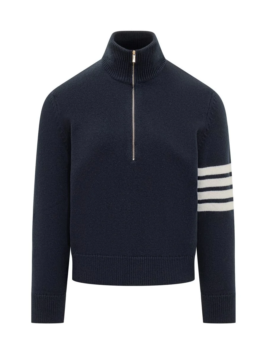 Navy blue Thom Browne sweater with half-length zipper, high neck and iconic white stripes on the sleeve. Gender: Men Material: 100% VIRGIN WOOL Color: BLUE Made in: Italy Product ID: MKA567AY1029 415 *Import tax/duty will be calculated at checkout (If applicable)
