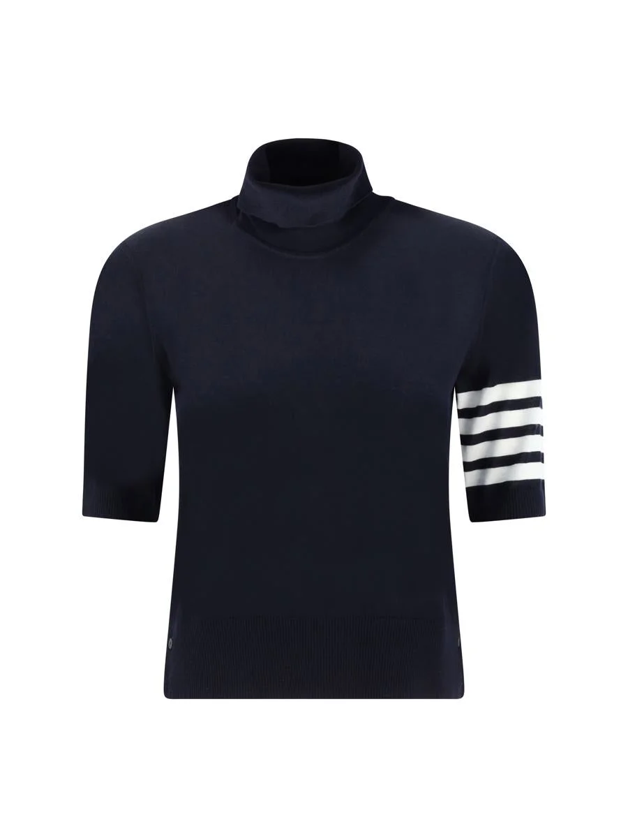 THOM BROWNE'S VIRGIN WOOL TURTLENECK SWEATER IS A REFINED AND SOPHISTICATED PIECE THAT COMBINES ELEGANCE WITH DISTINCTIVE DETAILS. WITH A RIBBED TURTLENECK AND SHORT SLEEVES, IT FEATURES A MONOCHROME PATTERN ENHANCED BY CONTRASTING HEMS. THE BRAND'S ICONIC BANDS ON THE LEFT SLEEVE AND THE RIBBED HEM WITH SLIGHT SIDE SLITS ADD A TOUCH OF ORIGINALITY. RTW IT Gender: Women Material: POLYAMIDE | FLEECE WOOL Color: BLUE Made in: Italy Product ID: FKA434AY1014_415 *Import tax/duty will be calculated at checkout (If applicable)