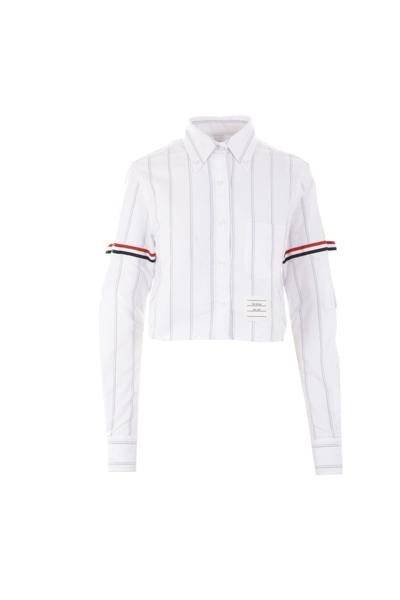 Thom Browne's cropped shirt crafted in white striped cotton Oxford with tricolor armbands. It features button-down collar, button fastening, long sleeves with buttoned cuffs, chest patch pocket and curved hem. The design is completed by the signature striped grosgrain loop tab at back. Gender: Women Material: SELF: 100% COTTON Color: WHITE Made in: IT Product ID: FLL183OF0660100 *Import tax/duty will be calculated at checkout (If applicable)