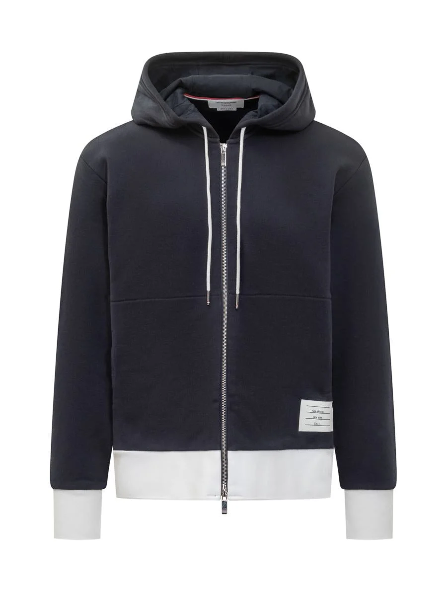 Thom Browne navy blue cotton sweatshirt with contrasting white details. Hooded design, zipper closure and logo patch at hem. Gender: Men Material: 100% COTTON Color: BLUE Made in: Imported Product ID: MJT517A03037 415 *Import tax/duty will be calculated at checkout (If applicable)