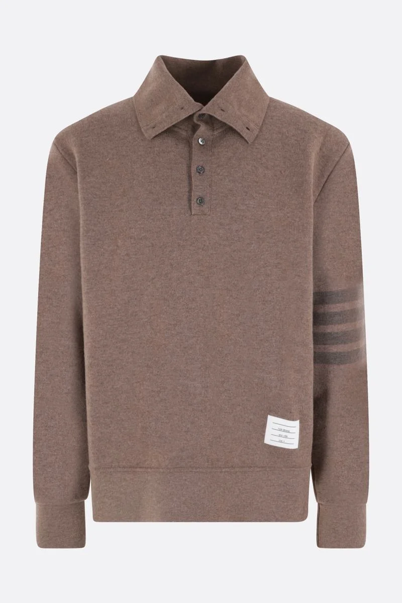 Thom Browne's pullover crafted in brown wool knit with 4bar detail at left sleeve and logo patch at hem. Featuring high neck, button closure, long sleeves and ribbed edges. The design is completed by the signature's striped grosgrain loop at back. Gender: Men Material: SELF: 100% VIRGIN WOOL ,COMBO2: 97% WOOL, 3% ELASTANE Color: BROWN Made in: IT Product ID: MJT389AJ0088210 *Import tax/duty will be calculated at checkout (If applicable)