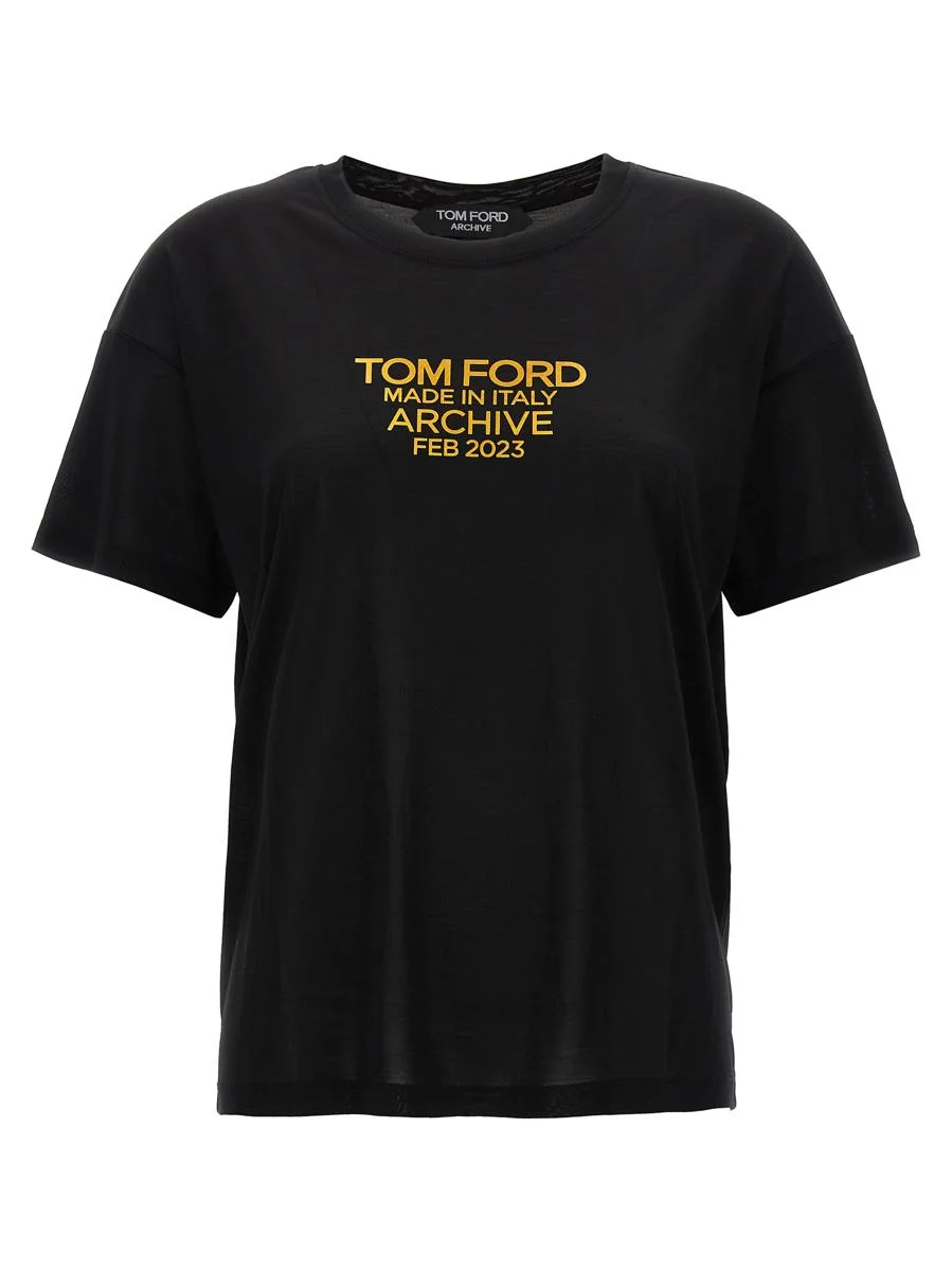 Silk T-shirt with front logo print, crewneck, and short sleeves Gender: Women Material: 100% SILK Color: BLACK Made in: Imported Product ID: TSJ560FAX835XLBGO *Import tax/duty will be calculated at checkout (If applicable)