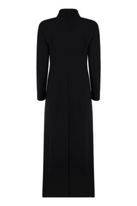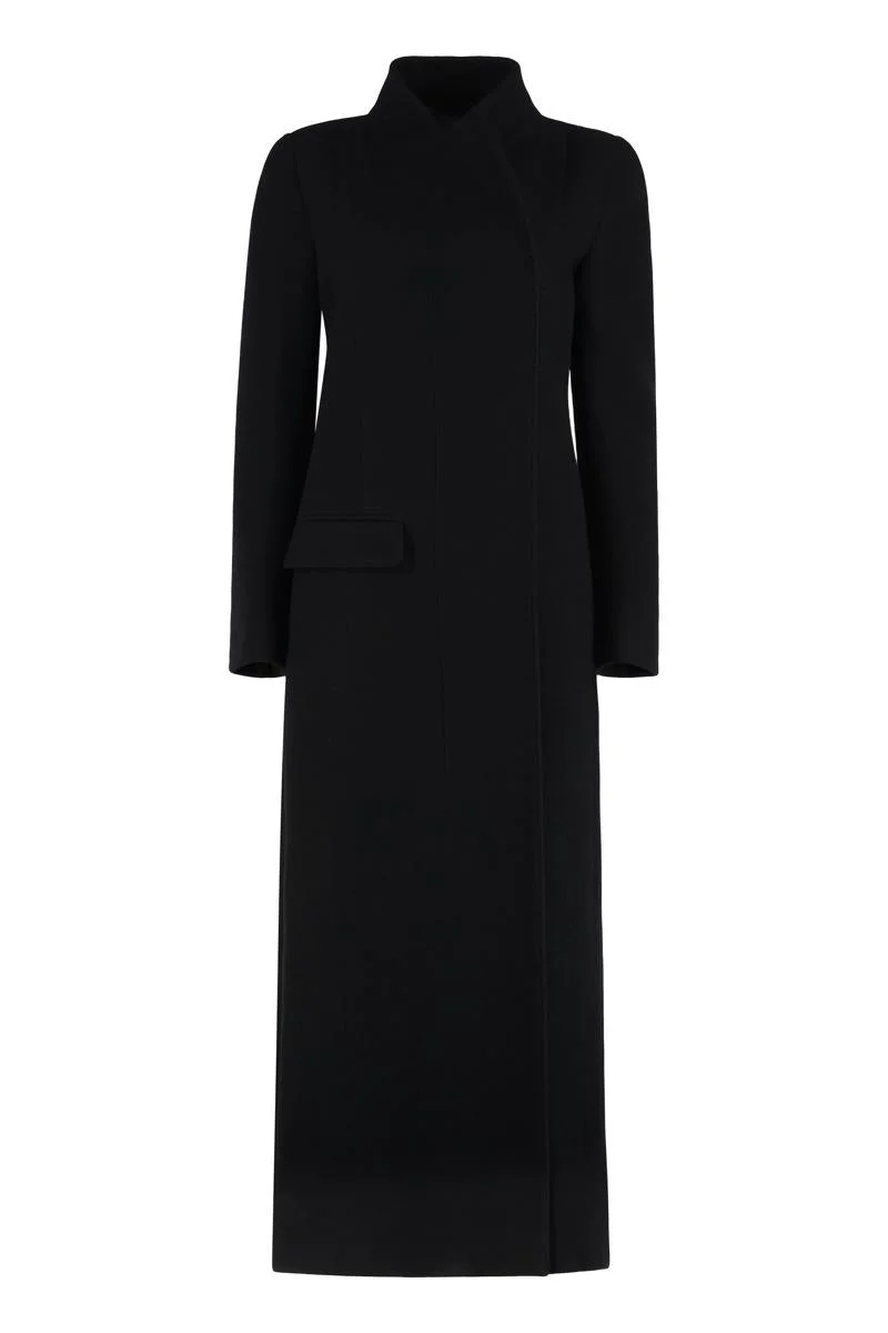 Long wool coat This long black coat features an elegant and minimal silhouette. It is characterized by a high neckline, button closure, and long sleeves, with a straight cut that falls to the ankles. The solid color gives a sophisticated look, making it suitable for formal occasions. Made with a soft fabric, it offers optimal comfort along with a contemporary style. Perfect to pair with metallic accessories or heels for a striking look. 100% Wool Gender: Women Material: WOOL Color: Black Made in: Italy Product ID: CP1649JEX178_LB999 *Import tax/duty will be calculated at checkout (If applicable)