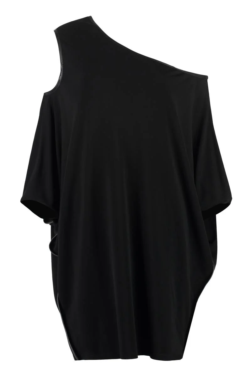 Off shoulder dress Asymmetric sleeves Leather trimming 100% Viscose Gender: Women Material: VISCOSE Color: Black Made in: IT Product ID: ABJ700FAX162_LB999 *Import tax/duty will be calculated at checkout (If applicable)