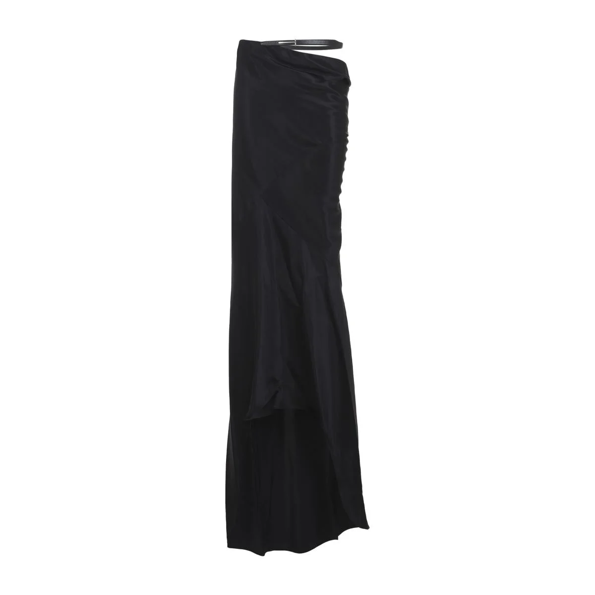 Tom Ford Black Silk Midi Skirt. Pure black silk skirt, dropped waist, tonal belt detail on the waist, side draped design, asymmetric hem, long-length. Gender: Women Material: 100%SILK Color: Black Made in: Italy Product ID: GC5828.FAX1664_999 *Import tax/duty will be calculated at checkout (If applicable)