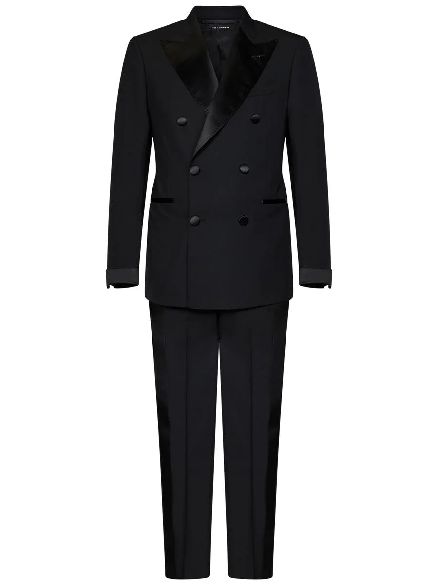 Blazer: double-breasted six-button placket; satin peak lapel; long sleeves, structured shoulders, four-button cuffs with satin turn-up hems; welt waist pockets with satin trim, chest pocket, inner pockets; satin covered buttons; lined Trousers: covered front closure; satin waistband with side adjusters with metal buckles; side slant pockets, back welt pockets with satin trim and button; satin bands at side legs; pressed legs creases Black color 100% Wool; Blazer lining: 59% Cupro, 41% Silk Made in Switzerland Gender: Men Material: 100% WOOL Color: Black Made in: Imported Product ID: 2ESPT2WOS02LB999 *Import tax/duty will be calculated at checkout (If applicable)