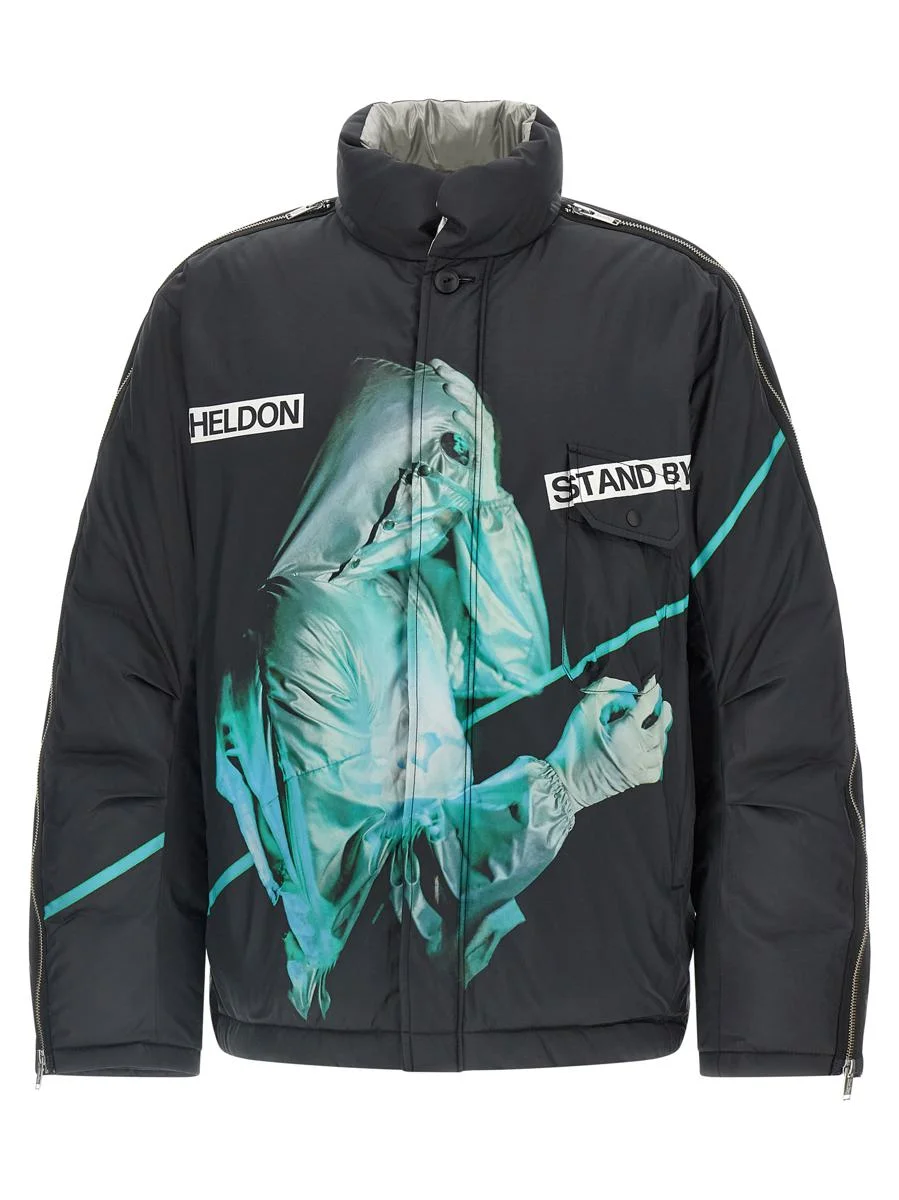 'UC2E4204' nylon down jacket with goose feather padding, prints with works by the artist French HELDON, high neck, zip closure and front snap buttons, pockets, long sleeves with zip all over the sleeve, drawstring on the asymmetrical hem Gender: Men Material: 100% POLYESTER Color: Black Made in: Imported Product ID: UC2E4204BLACK *Import tax/duty will be calculated at checkout (If applicable)