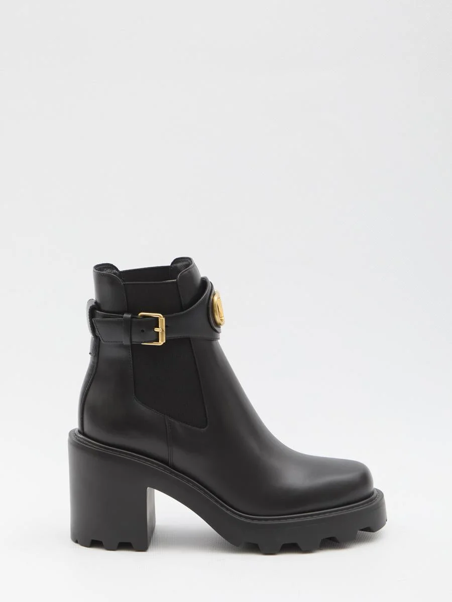 Black calf leather ankle boots. Featuring side elastic panels, adjustable strap with buckle, and antique gold metal VLogo Signature on the front. Lug sole. Dust bag included. Any natural imperfections in the leather are not considered manufacturing defects but a unique characteristic of the material. Heel height with platform: 9 cm Heel-to-toe drop: 7 cm Size ITA. Size nationality: IT Gender: Women Material: UPPER: 100% CALFSKIN; SOLE: RUBBER Color: Black Made in: Italy Product ID: 38408586 7W2S0KY9 BEK 0NO *Import tax/duty will be calculated at checkout (If applicable)