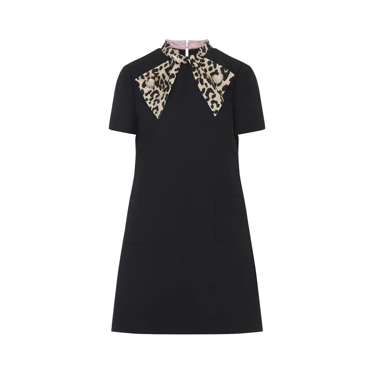 Valentino Black Virgin Wool Dress. Crafted in virgin wool and silk blend. Stand up animalier collar with front bow detail, front gold-tone heart-shape pin with crystal details, back hooked and zipped fastening, short sleeves, mini-length, straight hem, A-line. Gender: Women Material: 65%VIRGIN WOOL 35%SILK Color: Black Made in: Italy Product ID: 7B3VAFH51CF_ *Import tax/duty will be calculated at checkout (If applicable)
