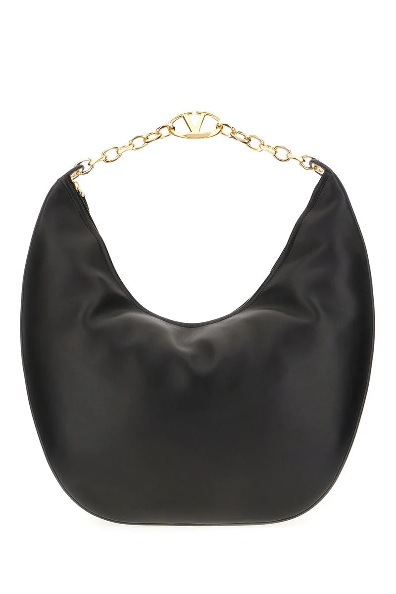 The VLogo Moon Bag hobo bag by Valentino Garavani is made of leather and features a chain handle detailed with the iconic VLogo Signature element. It has a top zip closure, a nappa-lined interior with an open pocket, and gold-finished metal accessories. Bag length: 37 cm Bag height: 46 cm Bag weight: 13 cm Handle height: 45 cm Gender: Women Material: 100% CALF LEATHER Color: Black Made in: IT Product ID: 4W0B0N45PHV 0NO *Import tax/duty will be calculated at checkout (If applicable)