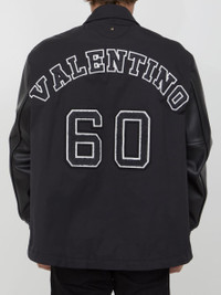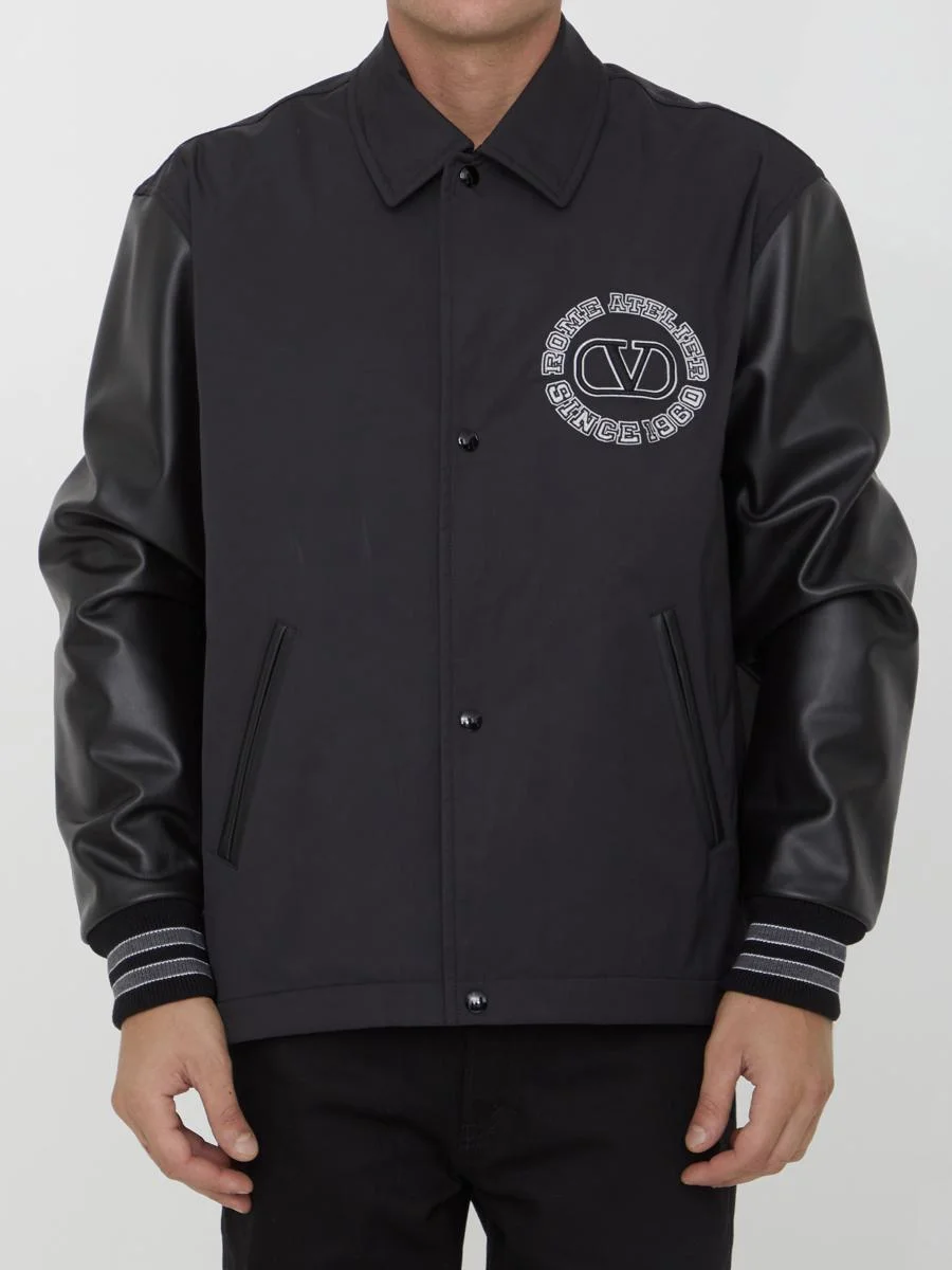 Track jacket in slightly padded black nylon with leather sleeves and Valentino patch on chest and on the back. It features classic collar, front press-stud closure, two side welt pockets and rib-knit striped cuffs. Regular fit. The model is 184cm tall and wears size IT 50. Size nationality: IT Gender: Men Material: 64% POLYESTER, 36% ELASTANE Color: BLACK Made in: IT Product ID: 37013817 3V3CIN05 9F9 0NO *Import tax/duty will be calculated at checkout (If applicable)