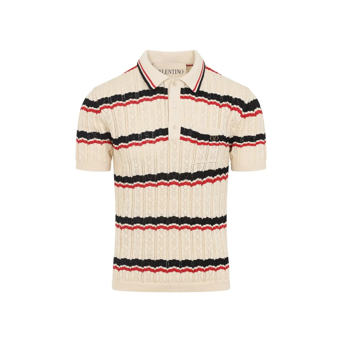 Valentino Ivory Cotton Polo. Ivory knitted cotton, red and black striped pattern all over, polo collar, three-button front fastening, patch pocket with metal Vlogo detail at the chest, short sleeves, ribbed edges, straight hem. Gender: Men Material: 100%COTTON Color: WHITE Made in: Italy Product ID: 7V3KP03XB0S_6 *Import tax/duty will be calculated at checkout (If applicable)