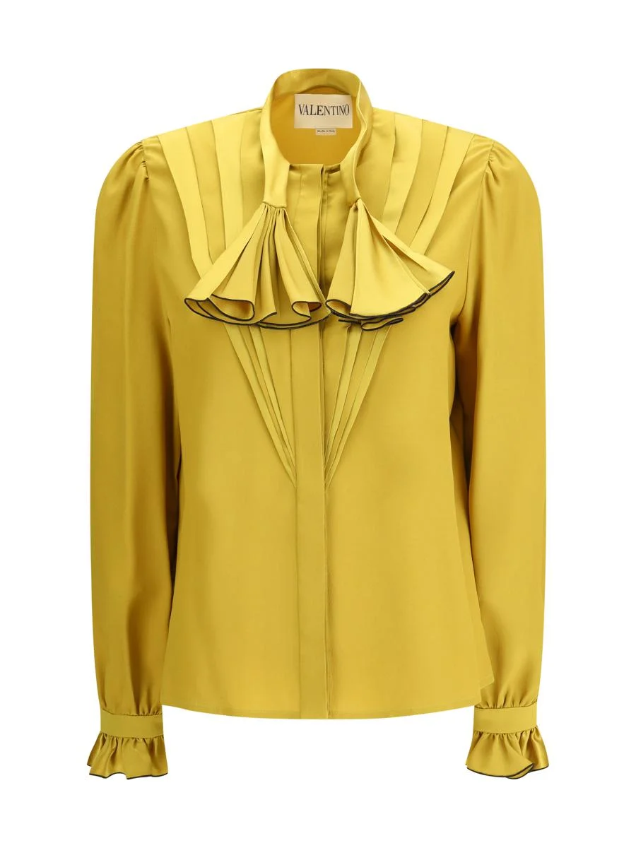 VALENTINO GARAVANI'S RUFFLED AND PLEATED SILK BLOUSE EXPRESSES SOPHISTICATED FEMININITY THROUGH FLUID AND SOPHISTICATED DETAILS. THE BOW COLLAR AND V-SHAPED PLEATS AT THE FRONT GIVE MOVEMENT TO THE SILHOUETTE, WHILE THE GATHERED BUTTON CUFFS COMPLETE THE RELAXED SILHOUETTE WITH A TOUCH OF TIMELESS ELEGANCE. RTW IT Gender: Women Material: SILK Color: YELLOW Made in: Italy Product ID: 7B0AB8008C7_6Y0 *Import tax/duty will be calculated at checkout (If applicable)